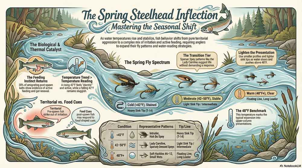 Spring steelhead swing flies shift away from winter’s oversized leeches and egg patterns as rising water temperatures expand what fish will respond to on the swing. The key driver isn’t the calendar — it’s the thermometer and its direction. When water climbs steadily through the low-to-mid 40s°F, steelhead move more aggressively, hold in shallower lies, and respond to sparser, more natural fly profiles that winter conditions rarely reward. Understanding this temperature-driven transition — and the biology behind it — puts the right fly in front of fish that are behaving differently than they did in January.